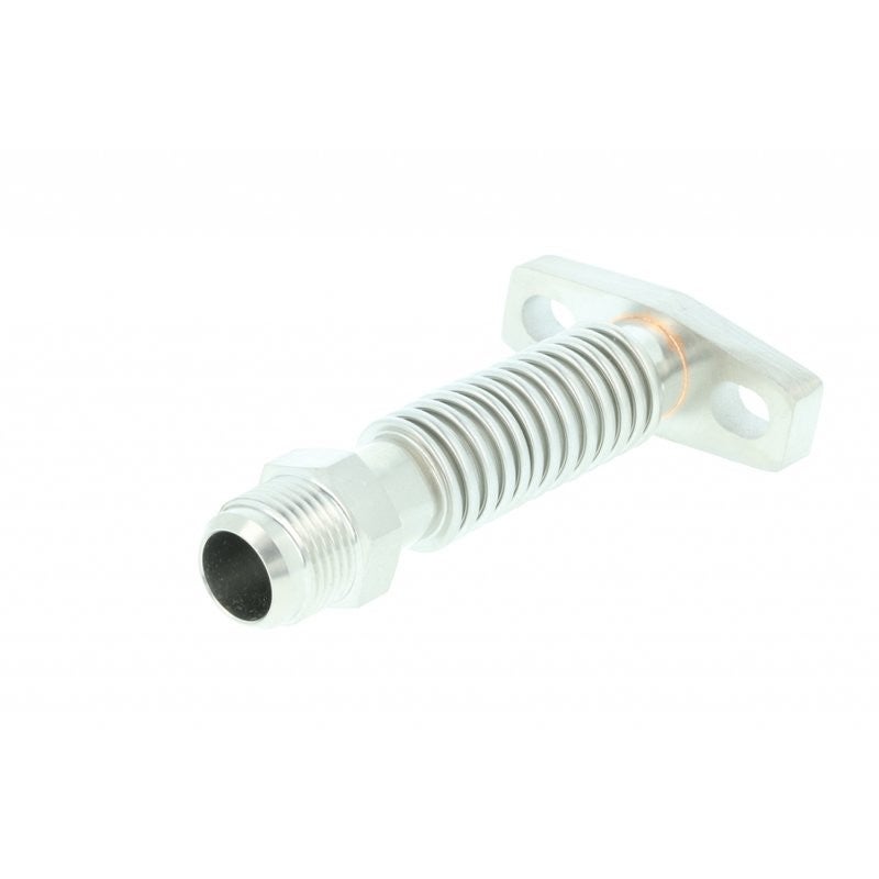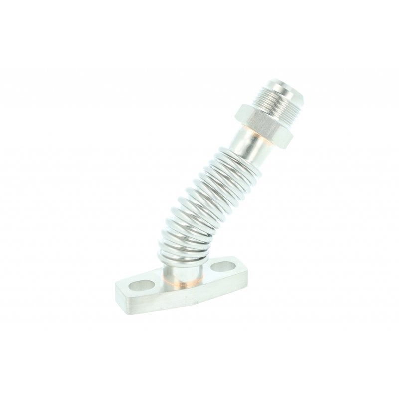 Our innovative oil return flange is the solution for every problem which occur regarding the oil return. It combines a solid pipe which is essential in hot areas but also gives the flexibility which usually only provides a hydraulic line. Once bend it stays in position and needn't be fixed in a complicated way. Vibrations and engine movements are no problem for this pipe. At the end is a Dash 10 outer thread which offers the possibility to continue adjustable with hydraulic connections or hydraulic lines. You need another extension of the solid pipe? Because the complete set up is made of stainless steel you can cut the Dash 10 thread and weld on another stainless steel pipe. Due of the long bores a certain flexibility for other turbochargers with a similar flange connection is given. The profile of the return bore is in the right size for the necessary return of the oil.